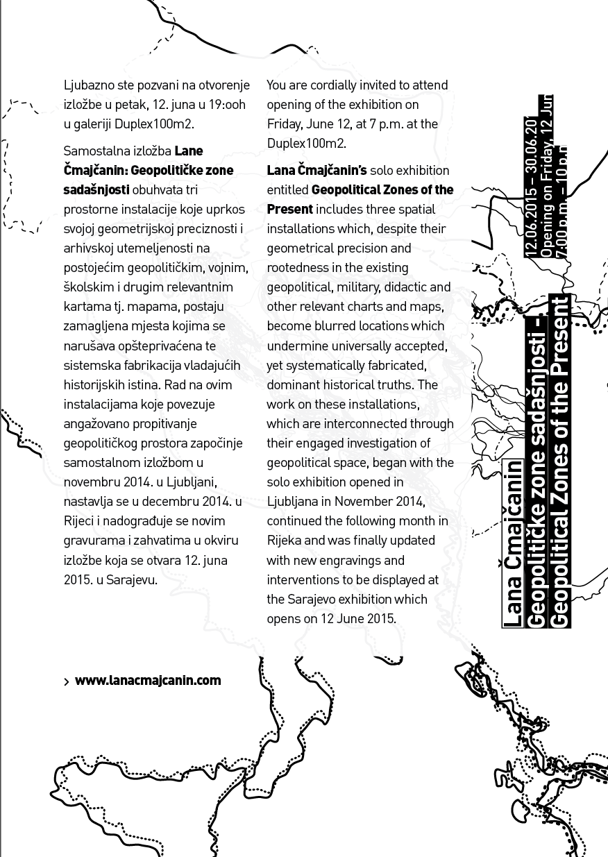 Lana Čmajčanin’s solo exhibition entitled Geopolitical Zones of the Present includes three spatial installations which, despite their geometrical precision and rootedness in the existing geopolitical, military, didactic and other relevant charts and maps, become blurred locations which undermine universally accepted, yet systematically fabricated, dominant historical truths. The work on these installations, which are interconnected through their engaged investigation of geopolitical space, began with the solo exhibition opened in Ljubljana in November 2014, continued the following month in Rijeka and was finally updated with new engravings and interventions to be displayed at the Sarajevo exhibition which opens on 12 June 2015.